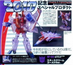 Floating around the rumor mill for awhile now, the magazine Figure King, has revealed images of Masterpiece Ghost Starscream. This clear figure will be an e-Hobby exclusive, a release date may be listed, but my Japanese is pretty rough. After the jump, enjoy the pretty picture!