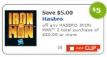 In addition to the $5 off Star Wars coupon (see below), Hasbro has also posted a $5 off $20 coupon for the purchase of Iron Man 2 toys. You can grab this coupon for printing (twice usually) over here. Toys R Us often accepts coupons, so this is a great chance to grab 4 figures for ~ $17.