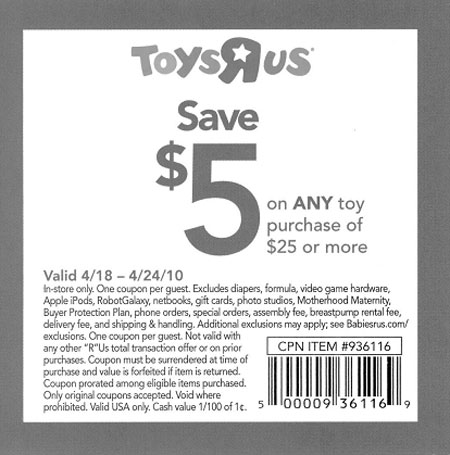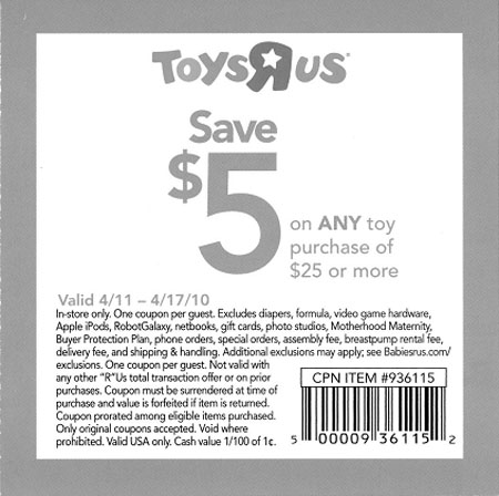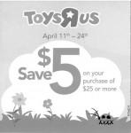 Today at Toys R Us I picked up a coupon booklet with two $5 off ANY toy purchase of $25 or more. One coupon is good from April 11th to the 17th and the 2nd from April 18th to the 24th.