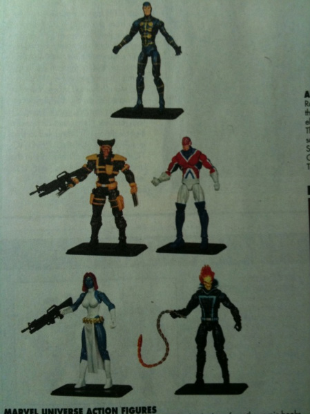 Finally is an image of what is believed to be Marvel Universe wave 10. In the line up we have Jamie Madrox the Multiple Man, Wolverine, Captain Britain, Mystique and Ghost Rider. Loving the Mystique and Ghostrider…Wolverine is giving me a ToyBiz vibe (in this case, that’s bad). Check out a picture here.