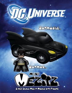 Batman, the legendary character of film, television, radio, and comic books now becomes the 1st Mez-Itz character produced with a vehicle; the Batmobile! This 2 inch figure feature all the coolness and articulation of his larger counterpart at 1/3 the size. Batman can fit inside this famous car, The Batmobile, and still have room for a 2nd passenger! The Batmobile is the first car to ever be transformed into a Mez-Itz vehicle. It measures nearly 6 inches long, features a detailed cockpit, and has a convertible hardtop so the Dark Knight and a passenger can fit inside.