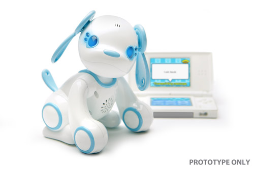 During Toy Fair I had the opportunity to get a preview of an upcoming Activision product, Wappy Dog. Wappy Dog is an innovative product which combines the pet simulation genre of gaming (think NintenDogs) with a robotic dog (i.e. Aibo). Developed for the Nintendo DS, players can interact, care for, and play with Wappy on the DS, while the robot dog responds, expresses emotion and plays along. For example, though the game you can ask Wappy to sing and dance, and the robotic dog responds by singing or dancing. But play isn’t restricted to when you are in the presence of the robot, you can effectively ‘download’ your Wappy into your DS for on-the-go play. Development of new skills, games, personality traits that occur when in ‘Outing Mode’ can be transferred back to Wappy when you return home and synch Wappy and your DS. This enables the player to have some flexibility with Wappy, always keeping the gaming fresh. To help with evolving game play, Activision indicated that the game would likely support DLC, allowing content to be added.