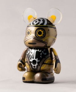 Coinciding with the kick off of this years’ San Diego Comic-con, the Disney Store released their exclusive series of Robot Vinylmation figures. Vinylmations, if you’re not familiar with them, are 3 inch vinyl figures which all have the same shape (that of Mickey Mouse) but have different paint decos – each series of figures have different themes. The figures are blind boxed, so you never know which you’re going to get. There are a total of 12 designs in the Robots Vinylmation series (I love Ignition-Bot and AudioSonic-bot); the one in my box was the Steampunk-Bot as designed by Gerald Mendez.
