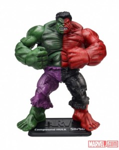 A few weeks ago, not only did Hasbro announce their debut at NYCC, they also announced that they would have some exclusive merchandise with them. Details on this exclusive items are now being shared. First, via the Nerf Facebook page – the Bumblebee Nerf gun is a follow on piece to the SDCC exclusive Optimus Prime Nerf gun. The foam weapon features Bumblebee-centric IDW comic art. Today, on Marvel.com, the Marvel Universe “Compound Hulk” figure was announced. He’s 1/2 green Hulk and 1/2 Red Hulk, and very Christmasey! Check out images of the exclusives below.