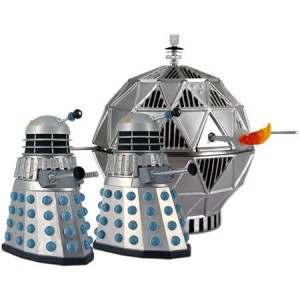 Yet another new Classic Doctor Who set popped up on Forbidden Planet today; a Dalek set from the William Hartnell story “The Chase”. The set, due in the UK in December includes 2 Daleks (silver with blue bumps) and a Mechanoid. No US distribution has been announced yet; but this is typical (as the Leela & Stor set has just hit US retailers). Check below for an image of the figures in this set!
