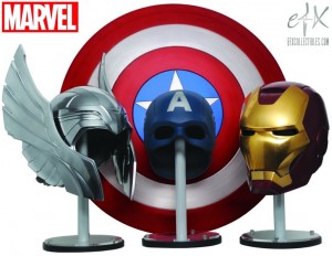 eFx Collectibles, known for collectibles based on iconic properties such as Star Wars, Star Trek, Battlestar Galactica and Disney are adding Marvel Comics to their liscensed properties. The full product line will be revealed in the first quarter of 2012 and prop replicas from ‘The Avengers’ will be on display at WonderCon (3/16 – 3/18). Prop replicas from ‘The Avengers’ includes Captain America’s shield, Iron Man’s helmet, Thor’s hammer and helmet. In addition to high end collectibles, there will also be lower price products putting these into the reach of every fan. Check below for a preview pic of the products and see the whole press release after the jump.