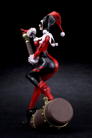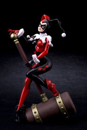 Harley Quinn shows off her silly and violent natures as she poses seductively just for you. Perched on her enormous hammer, the sultry psychotic looks adorable in her trademark black, red, and white harlequin costume that hugs all of her curves. Harley’s sculpt is fantastic with careful attention paid to her sexy body, the cloth-like movement of her collar and hood, and the fringes on her wrists. With Quinn’s stunning Bishoujo-style face and wonderfully sculpted and painted costume, you won’t need to be as crazy as the Joker to want her around.