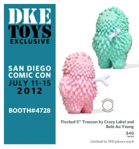 Straight from DKE Toys comes news of their third SDCC exclusive. From Crazy Label and Bubi Au Yeung comes the 5″ flocked Treeson. Available in two colors, pink and a minty green these adorable and fuzzy pieces are limited to just 150 and will cost $40 each at the show. Check them out below.