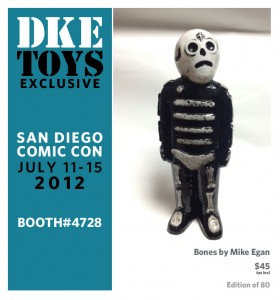 While the AwesomeToyBlog staff was camping this weekend, DKE Toys announced another pair of SDCC exclusives. Up first is the first toy from artist Mike Egan, Bones, an 8″ tall handpainted figure by Luke Rook/Lullubell/Grody Shogun in vinyl. Bones is limited to an edition size of 80 pieces and is priced at $45. There may be more than one colorway at the show!