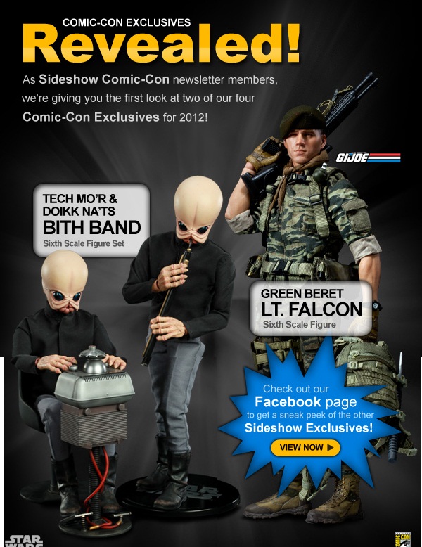 After weeks of teasers, Sideshow has revealed their first two exclusives for this year’s show. While there are no price details or pre-order information shared, we can at least stare at the image. From their 12″ GI Joe line comes the Green Beret, Lt. Falcon. And from the Star Wars universe you’ll have your chance to build your Bith band with the addition of Tech M’or and Doikk Na’ts.