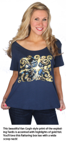 Doctor Who is the longest-running sci-fi series in the world and has a wide and diverse fanbase. In that fanbase are lots and lots of woman, so the announcment from Her Universe that they’d be expanding their product line to include designs from Doctor Who is both welcome and smart. The new Doctor Who collection by Her Universe will premiere at San Diego Comic-con in July with fashion tops featuring images, characters and phrases from the Doctor Who universe. To top it off, BBC Worldwide has created a special Doctor Who logo which will only appear on merchandise from Her Universe! Check out a few sample designs below and, after the jump, the full press release.