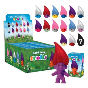Dark Horse sent out a press release today updating the status of their relaunch of Good Luck Trolls, which are locked and ready to go. Using the ‘blind boxed’ approach, the first 15 variations of trolls will be available starting July 25th. Variations include trolls of various colors and with unique surface treatments, including metallic, flocked, black-light sensitive, glitter, and glow-in-the-dark. To celebrate the relaunch, Dark Horse will have a one time limited edition troll at SDCC. Limited to 1500, this troll will have a green body with snow white hair where both will react to black light. Check it out below along with a preview of the retail varieties.