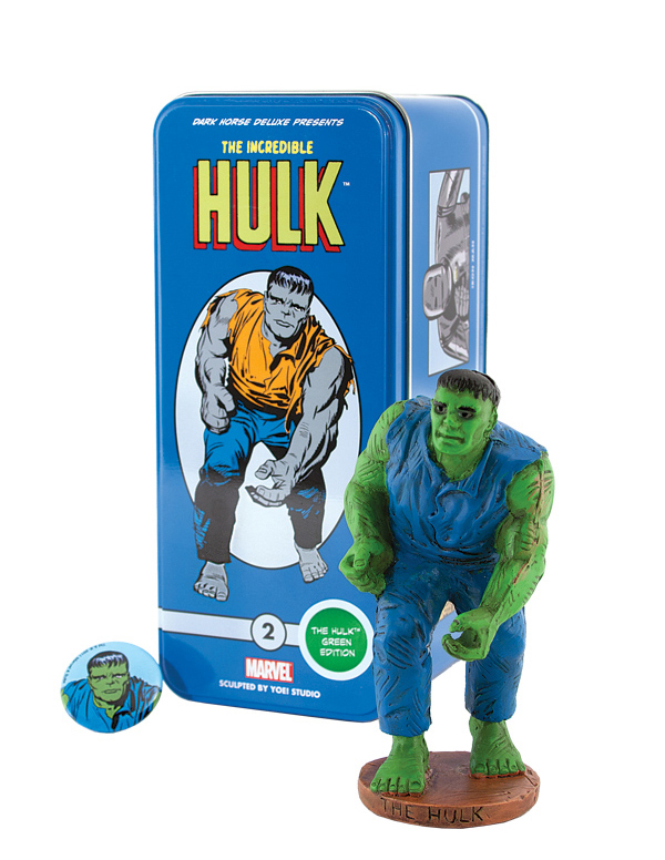 - Marvel Classic Character: The Hulk Green Variant (Limited Edition of 200) – Similarly Dark Horse is offering a green Hulk also as a very limited-edition Syroco-style statuette. Hulk stands 4 3/4″ tall, and comes in a litho-printed tin box, with a pin-back button and a booklet.