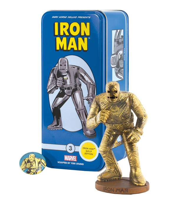 - Marvel Classic Character: Iron Man Gold Variant (Limited Edition of 200) – Introduced last year, Dark Horse’s line of Syroco-styled statues have continued through the year. For Comic-con, Dark Horse is offering Iron Man in this gold-colored iron suit. This Comic-Con exclusive limited-edition Syroco-style statuette stands 4 3/4″ tall and comes in a litho-printed tin box, with a pin-back button and a booklet.