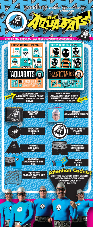 Dave Perillo always wanted to work on an Aquabats piece, so they put rad with rad and made it happen. Then, MC Bat Commander (he has toddland on speed dial) requested that they make a whole bunch of crazy stuff to share with their fans at comic con. So poof! (thats what magic sounds like), it happened. They’ve got Aquabats capes ($10), special wallets ($20), A Uniform underpants set ($25), Aquabats Pajama Party set ($30) and some other craziness like socks ($12), boxers ($15), pillows ($15), and floating keychains ($5)! The Aquabats panel is Friday night from 8pm-9pm in room 7B. Keeping the comic con tradition alive, they will be performing at the House of Blues San Diego on Saturday night (Doors at 630), and all the Aquabats will be in the booth on Saturday from 11am – 1pm for photo op and signing!