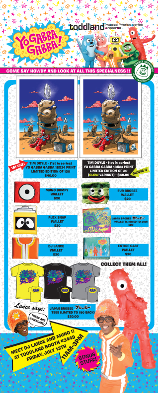 In addition to the Tim Doyle prints and the Japanese Brobee shirts, they will have all of their Yo Gabba Gabba charachter wallets as well. Never a dull moment with toddland, their Brobee wallet is made out of fur (not real fur), the Muno wallet actually has bumps on it, and the Plex wallet has a snap shut antenna! Also, DJ Lance AND Muno will be in the booth (#3449) on Friday from 11am-3pm for photos.