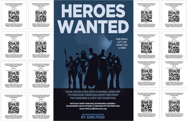 During SDCC the Michael J. Wolf Fine Art Gallery (363 5th Ave., San Diego) is hosting the Darkness & Light: Art Inspired by Heroes & Villains, Hope & Heroism art exhibition. During this show, patrons will have the opportunity to order Junk Food vintage tees featuring select art from the show, simply by scanning a QR Code on the gallery curatorial card. For each shirt purchased, $15 will go to provide hunger relief in Africa via the WE CAN BE HEROES campaign. This $15 donation represents 10 nutritious meals to a needy child in Ethiopia.