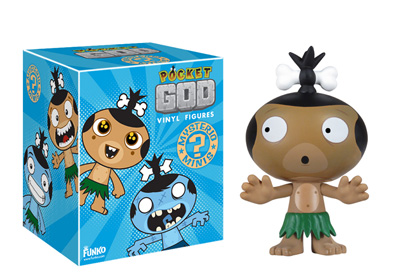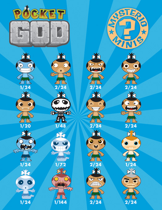 Funko sent out some exciting news today, they are entering the world of blind bagged figures with their August release of Pocket God vinyl figures. Pocket God is the 4th highest selling app in the iTunes App Store – for all time, it’s been ranked #1 for 2 months and has been in the top 50 for 3 years – so it’s a popular app. Based on the game, Funko’s releasing 16 pygmy figures in the blind bagged format. Each of the figures are packed at different ratios, with the rarest being 1 per case (1 case = 6 display boxes of 24 figures each). You can see the display box, the individual figures and the packing ratio in the gallery below.