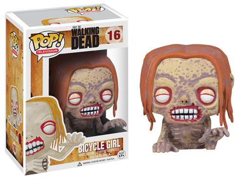 Funko sent out news today announcing a new licensed property joining the ranks of Pop! vinyl and Wacky Wobblers. From the hugely popular AMC show ‘The Walking Dead’, Funko’s got 4 Pop! vinyl figures on tap. Set to launch in time for the season 3 premier are Rick Grimes, Daryl Dixon, RV Walker Zombie, Bicycle Girl Zombie. Also on tap are special exclusive blood splattered figures in blood splattered boxes. From Harrison’s Comics are Sherriff Rick & Daryl; Gemini Collectibles has the RV Walker and Diamond Comics has the Bicycle Girl. Check them out below!