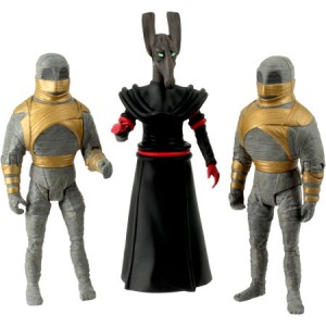 This morning I woke to the news that Forbidden Planet had announced a new entry in the Doctor Who Classics line, a box set based on the 4th Doctor classic episode ‘Pyramids of Mars’. This is one of my favorite 4th Doctor episodes, so I’m thrilled to see Sutekh in toy form! This set includes a jackel headed Sutekh (he’ll likely be released in a different set masked) and 2 guardian Mummies, featuring gold wrappings that will differentiate them from the previously released Mummies. These have an October release date listed for the UK, any US release details have not yet been announced.