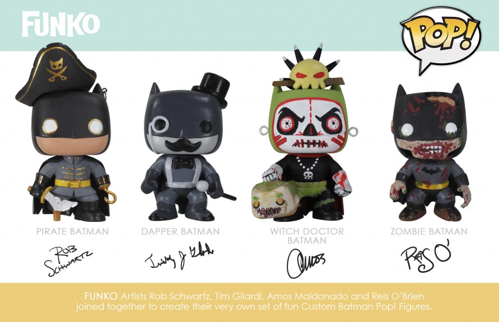 Got sent a super cool image from Funko today. Several of the Funko artists, in their downtime, have taken to customizing Pop! vinyl and have made a set of four ‘artist series’ Batmen. Right now these exist only as custom figures, but there’s a chance these could be released. Either way – very cool pieces from some super talented artists (I’m torn between the Witch Doctor and Dapper Batman as my favorite)! Can’t wait to see what other pieces Rob Schwartz, Tim Gilardi, Amos Maldonado and Reis O’Brien have in the can.