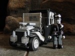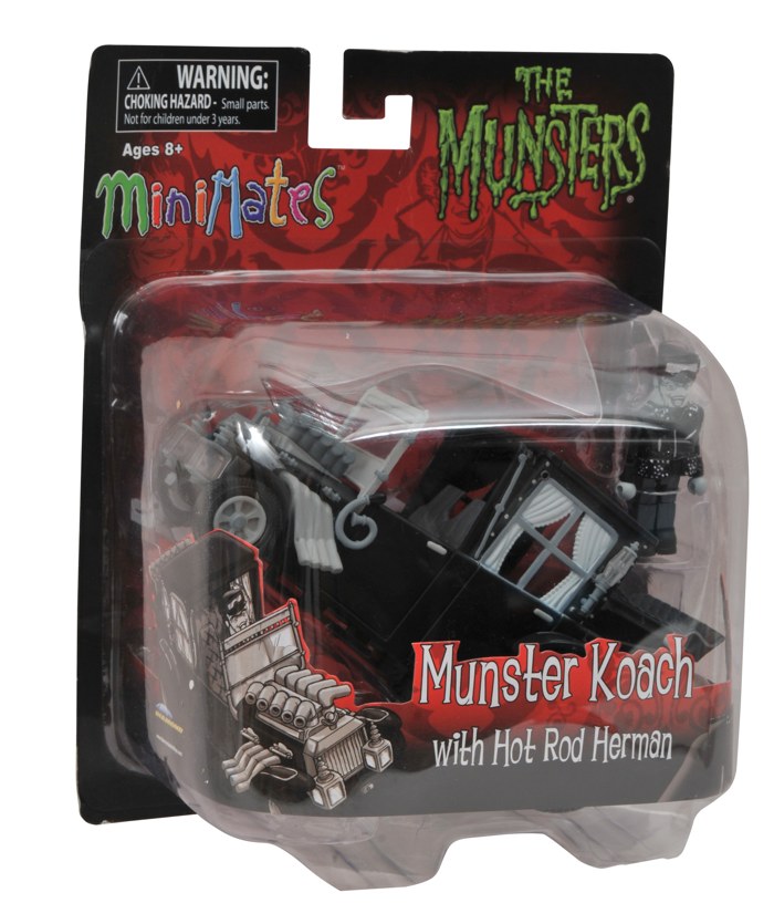 Diamond Select Toys is putting focus on The Munsters car – the Munster Koach. This special minimates vehicle will be available in color (at Toys R Us) and in black and white at comic and specialty stores. A Herman Munster minimate is included with either car , the color version includes a second head and a monochromatic one is decked out in his drag racing outfits.