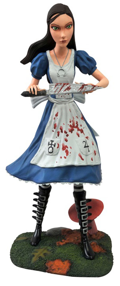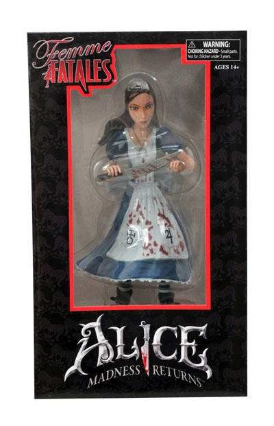 The newest Femme Fatale is also the first to come from the world of video games! Based on artist American McGee’s designs for the hit sequel Alice: Madness Returns, Alice holds a bloody Vorpal Blade and has clearly been up to no good, if the state of her dress is any indication. Sculpted by Steve Kiwus atop a mushroom-festooned base, this PVC statue stands 9 inches tall and comes in a window box. SRP: $45.00