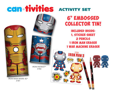 On the new product front are boxos papercraft playsets – the Hall of Armor / Tony’s penthouse suite which includes 4 papercraft figures. Cantivities, which will be coming up for other properties, are 6″ character tins that hold stickers, pencils and character erasers. The crafting toys will be available March.