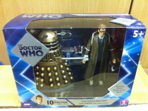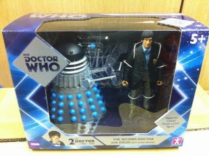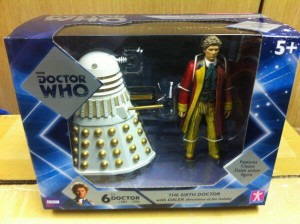 Currently an exclusive to UK Toys R Us, 11 2-packs are planned for 2013 which will pair a Doctor with a Dalek from one of his era’s Dalek stories. The first 3 sets were revealed the other day and include a 10th Doctor with a ‘The Stolen Earth’ bronze Dalek, a 2nd Doctor with an Evil of the Daleks Dalek (love the color scheme on this one) and a 6th Doctor with a Revelation Dalek. These appear to be largely repackages of previous figures.
