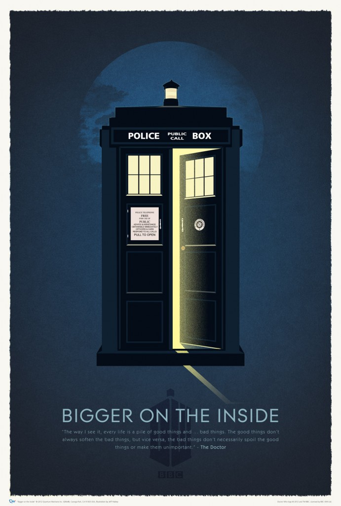 2013 is the 50th anniversary of Doctor Who, and there is going to be a ton of product to commemorate the event. Quantum Mechanix is honoring the anniversary with their reveal of their 50th anniversary art print. The print features a TARDIS with an open door in front of a full moon. The text below ‘Bigger on the inside’ features the Doctor’s insight of the balance of good and evil. Priced at $20, this 27″ w x 40″ h print will be available later this month. Check it out here.