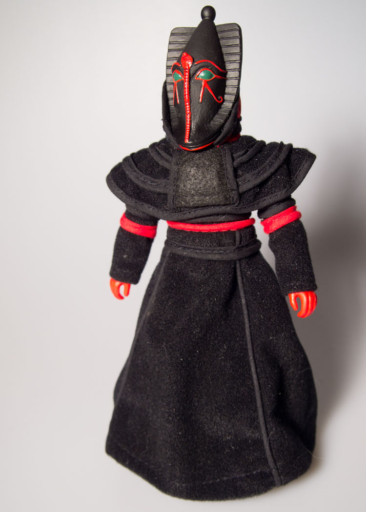 Sutekh, partnered with Leela make up the 3rd series of retro figures. Sutekh joins the 4th Doctor, the Master, the Cyberman and the Sontaran Styre and is among the best of the figures released yet. It looks like some lessons were learned from the first two series of figures, resulting in a vastly improved third series. The cloth costume is fantastic with a significant amount of detail for something that is essentially a black robe with some red trim. This would have been an opportunity to take a few short cuts and simplify the costume, but I’m thrilled they weren’t taken. Sutekh’s mask is also quite good, properly scaled to the body, well detailed and perfectly painted. Perhaps the only request I could make for this figure, and it is a bit unreasonable, be that it include light-up eyes…lifted right out of the episode. But barring any electronic additions, this Suhtekh figures is one of – if not the best yet of Bif Bang Pow!’s retro range.