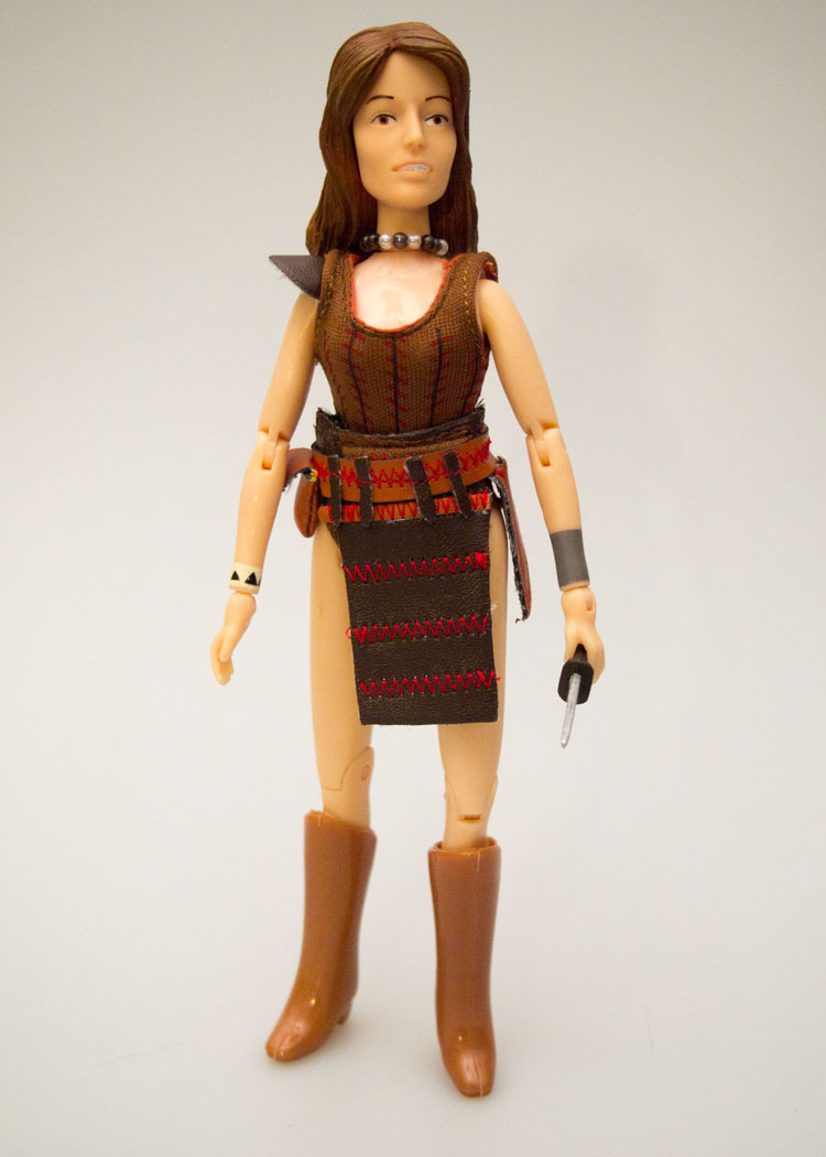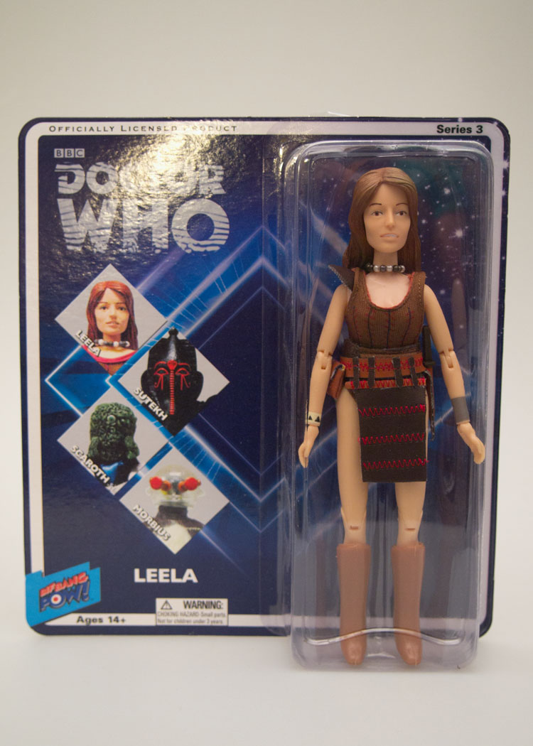 Today’s item is the the action figure of Leela, the 4th Doctor’s savage companion. Leela, partnered with Suhtekh make up the 3rd series of retro figures. As excellent as Suhtekh is, I’m not as excited by Leela. The 8″ retro aesthetic isn’t as kind to an animal skin clad warrior woman as it is to a fully robed Egyptian God. The cloth costume is still quite good, and features a good amount of detail. The head sculpt is good, but it does feel a bit out of scale with the body – if Leela had a full costume on, which would add bulk, it would likely look proportional, but given her scant apparel, it is a bit oversized. I also think that the sculpted hair isn’t completely successful – I’d love to see Leela with some rooted hair. These criticisms aside it’s awesome that there’s an update to the classic Denys Fisher Leela figure. It’s fitting that Leela was Bif Bang Pow!’s first (of many, I hope!) companion.