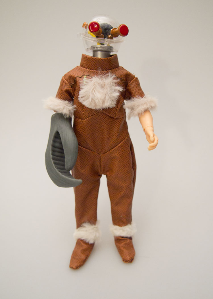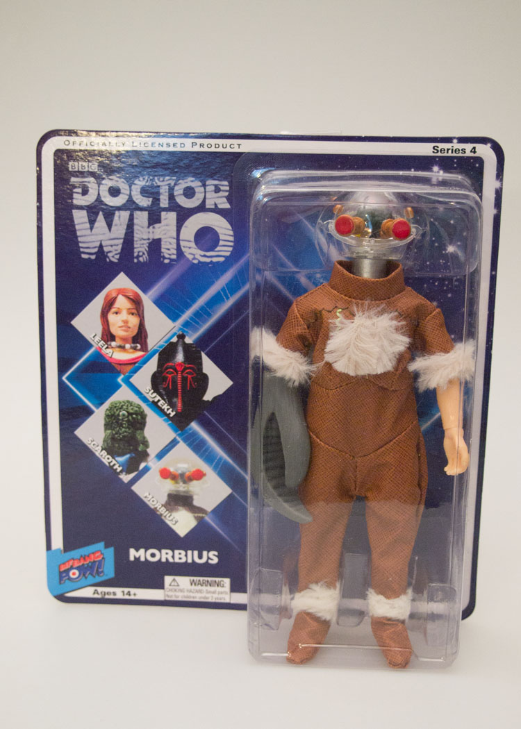 Today’s item is the the retro-action figure of Morbius, from the classic 4th Doctor story “Brain of Morbius”. This Doctor Who meets Frankenstein story culminates when Doctor Solon’s reanimation of the renegade Time Lord Morbius (who through most of the story was a brain in a jar) comes alive and fights the Doctor to the death! Morbius’s action figure is a fun take on this monster – which was built up from the bodies of crashed space ship pilots. He is wearing a vinyl jump suit with patches of white fur with his left arm replaced by a giant claw. The costume is a good take on the on-screen monster, including the details such as Morbius’ stitches across his chest. The ‘drop crotched’ jumpsuit helps make the figure’s proportions more alien. The stand-out part of the figure is easily the “head”. Morbius’s clear dome, eye stalks, brain and wires are top notch and fantastically executed. The third and fourth waves of Bif Bang Pow!’s retro-Who figures are overall very solid, and Morbius is on of the stars of these sets. If you’re a Whovian who isn’t picking these up – you’re missing out!