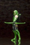 The Emerald Archer appears for the first time in the ARTFX+ lineup, posed with a wide stance as he scans for enemies and prepares to draw an arrow. Oliver wears his New 52 costume featuring a black and green outfit that leaves his arms mostly bare for shooting. With reinforced boots, a padded chest piece, and armored gauntlets Green Arrow is ready for anything, and the gold accents shine on his buckles and arrow emblem belt buckle. The archer holds his bright green bow sideways in front of him, ready for nocking an arrow from the full quiver on his back. Wearing his trademark green hood and mask, the focused hero still shows off a bit of his blonde hair and scruffy beard.