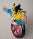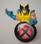 Now that Wolverine is free of his packaging, let’s take a look at the night light. This night light is essentially two units – one a small candle light bulb in a switched wall socket (the light part of a night light) and a Wolverine ‘bust’ that clips on to the light unit. Thanks to the clip used for attaching Wolverine to the lamp, you can display this without the night light – it simply leans back a bit like a picture frame. The bust part of the light is just over four and a half inches tall and has Wolverine from the waist up atop the X-Men logo. Wolverine is wearing his classic yellow / black uniform complete with blue shoulder pads. He’s posed with his claws out, ready to slash his enemies to shreds. The sculpt is true to the ‘vintage’ art style on the box artwork – in fact I think he’s got the same grimace right off the box. I’m far from an expert on sculpted night lights, but this is a pretty solid Wolverine.