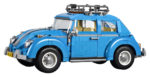 - 1960s VW Beetle with surfer theme features an array of brick-built details including an azure-blue color scheme, curved fenders, white rims with distinctive hubcaps, round headlights, wing-mounted turn signals and opening hood, trunk and doors.