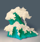 “Uprisings” by Kozyndan originated as an illustration inspired by the classic Hokusai woodblock print, “The Great Wave off Kanagawa.” Munky King has transformed the illustration into an art vinyl sculpture that can be displayed on its own or used as a bookend. Sculpted by Julie B of Pretty in Plastic. Featuring metallic turquoise water and pearlescent white bunnies cresting off the top of the wave, Uprisings is sure to fulfill every collector’s art object desire.