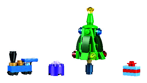 - Accessory elements include green wreathes, decorative lights and white tree pieces, plus wrapped gift elements and tiny brick-built toys, including a micro train, wind-up car, fire truck, remote controlled robot, sailboat and a spaceship.