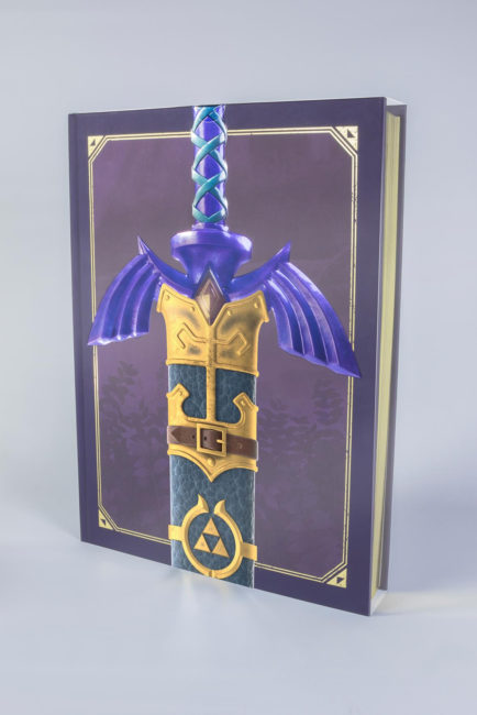 Fans who purchase The Legend of Zelda: Art & Artifacts limited edition will experience the thrill of finding and unsheathing the Master Sword! The cover features a 3D embossed sword hilt sculpt with a metallic foil finish. The sword hilt is life size to give the reader the satisfaction of unsheathing the very realistic sword from the acetate sleeve that encases the book. The cover’s background features the Lost Woods (a maze of mystifying forests that has appeared throughout the franchise) in a custom-mixed deep purple ink with a soft-touch lamination and spot-gloss UV, framed with metallic foil. The book’s pages are gilded as well.
