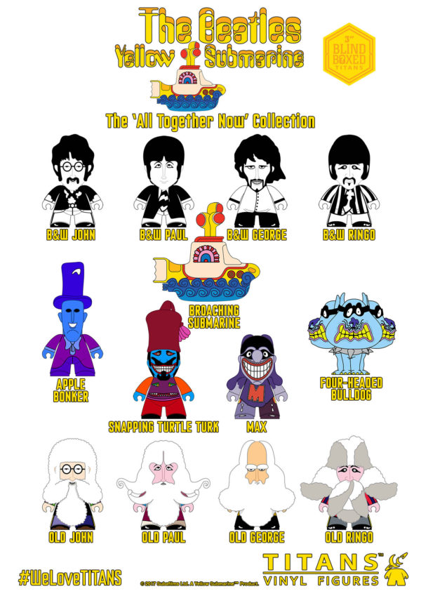 Titan Merchandise has announced the second wave of 3″ vinyls in their Beatles Yellow Submarine collection. This collection features the Fab Four – in both glorious black & white and as their older selves (you know, when they are 64), some more crazy Blue Meanies as well as their partners in badness – the Apple Bonker, the Snapping Turtle Turk and the fearsome Four-Headed Bulldog and some wild new Yellow Submarine variants.