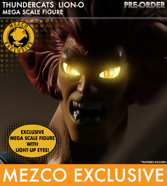 This Summer Exclusive Mega Scale Lion-O Light-Up Eyes Variant is only available through the Mezco Toyz website link here and at the Mezco Toyz SDCC booth # 3445