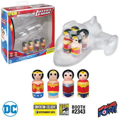 A limited edition created just for the convention, each 2-inch retro-style Pin Mate wooden figure is individually numbered within the DC Comics Pin Mate series and is highly detailed with bright beautiful colors all the way around the figure. Four wooden Pin Mate figures along with the WONDER WOMAN™ Invisible Jet are included in the set, and each figure shows the progression of WONDER WOMAN™ through the eras of her memorable legacy. Golden Age WONDER WOMAN™ (#36), Silver Age WONDER WOMAN™ (#19), New 52 WONDER WOMAN™ (#37), and Rebirth WONDER WOMAN™ (#52) all fit inside the Invisible Jet.