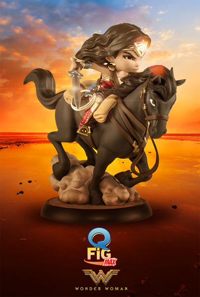 The DC Wonder Woman Q-Fig Max from Quantum Mechanix (QMx) is a fierce and fun incarnation of the powerful Amazonian warrior whose mission is to fight injustice and restore peace. Steely eyed and fully armed, this Wonder Woman rides her ebony steed clad in her trademark red-and-blue gear, and sporting her bullet-deflecting gauntlets and gleaming headband. Wielding a sword and golden Lasso of Hestia, she is ready for any battle that lies ahead.