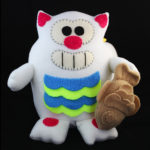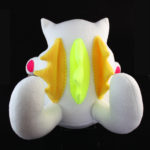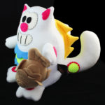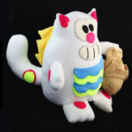 Purridge transforms into a Negora, also known as Catzilla or Neko Kaiju. It has two tails and spikes on its back. On its paw is a Japanese fish-shaped cake called Taiyaki, which is one of the popular street foods in Japan. The fish attaches to its paw using very strong magnets. Measures 12 x 12 x 12. Handmade by Cheri Lynn Ong.