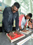 From left, Former Boston Red Sox star David Ortiz and current Red Sox center fielder Jackie Bradley Jr., add their handprints to the Pla-Doh “Wall of Fame” at HASCON the first-ever FANmily™ event from Hasbro, Inc., on Satday, Sept. 9, 2017 in Providence, R.I. (Josh Reynolds/AP Images for Hasbro, Inc.)
