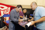 Peter Cullen, left, and Frank Welker, center, the voices behind two of the most iconic adversaries —TRANSFORMERS characters OPTIMUS PRIME and MEGATRON, sign autographs for Anthony De Capua, right, at HASCON – the first-ever FANmily™ event from Hasbro, Inc., on Saturday, Sept. 9, 2017, in Providence, R.I. (Stew Milne/AP Images for Hasbro, Inc.)