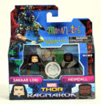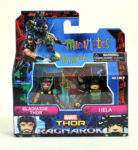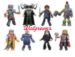 Three assortments or sets of figures are available now across North America. At Walgreens, four two-packs feature Gladiator Thor (with alternate hairpiece and swords) with Hela (with alternate hairpiece and head), Gladiator Hulk (with weapons and alternate hairpiece) with Valkyrie, and exclusive two-packs of Grandmaster with Skurge (both Marvel Minimates firsts!) and Roadworn Thor (with Mjolnir) with Civilian Loki. Visit Walgreens.com to find a location and check store availability.