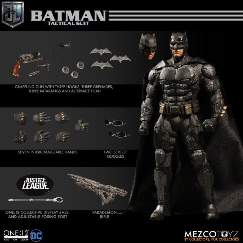 The One:12 Collective Tactical Suit Batman has two head portraits and a newly designed, film-accurate tactical suit. Designed for combat, the tactical suit was created to handle combat situations with super-powered adversaries, like the immortal Steppenwolf. The One:12 Collective Tactical Suit Batman also comes equipped with 2 pairs of goggles for display in up or down positions, a Parademon rifle, a trio of Batarangs, three grenades, and a grappling gun with three assorted hooks. He also includes a display base with logo and adjustable display post along with a cape clip with posing wires for dramatic displays.