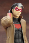 Jason Todd has always been a rebel, and here he stands in a defiant pose just begging you to look at him. As Red Hood he wears a super cool (and intricately sculpted) costume with black boots, reinforced black trousers, an armored black shirt decorated with a red bat logo, and a brown leather jacket with red accents and silver zippers. Of course, he wouldn’t be in the Ikemen style unless his pose and outfit highlighted Jason’s slim but muscular physique, and as Red Hood stands with one leg extended and one hand behind his head he shows off his toned body. The dark hero comes with interchangeable heads so you can customize your display: a full Red Hood helmet, a bare head revealing an aloof expression on his face and his black hair with a white streak, and exclusive to this first edition a bonus head wearing a sleek red domino mask! Sculpted by the talented Naoya Muto, Red Hood stands in 1/7 scale. Add this handsome hero to your collection and be on the lookout for more upcoming Ikemen Statues from Kotobukiya like Red Robin!