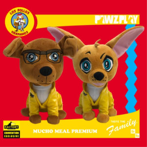 This set features a pit bull cosplaying as Walter White and a chihuahua cosplaying as Jesse Pinkman, both wearing their yellow lab coats. Each stands 8″ tall and the set comes packaged in a Los Pollos Hermanos Mucho Meal bag.